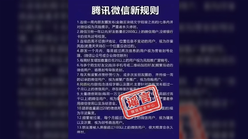 An image titled "Tencent WeChat New Rules" has been going viral online, suggesting that WeChat users who registered within a year and have more than 2,000 friends, without linking a bank card, will be prioritized for account suspension checks.