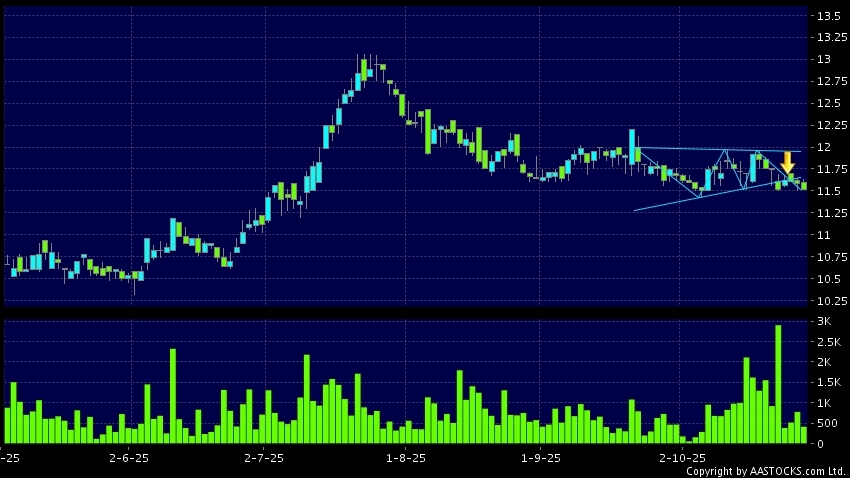 Triangle Breakout means the volatility of price movement is decreasing, stock price finally broke the bottom of triangle. A downward trend will start.(HK stocks quote is delayed for at least 15 mins.)