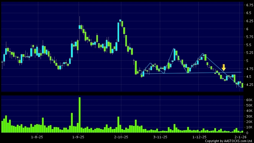 Head Shoulders top is a typical bearish signal, when stock price breaks the supportive level, downtrend would possibly start.(HK stocks quote is delayed for at least 15 mins.Short Selling Data as at 2026-01-08 16:25.)