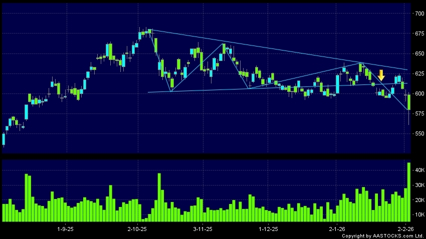 Triangle Breakout means the volatility of price movement is decreasing, stock price finally broke the bottom of triangle. A downward trend will start.(HK stocks quote is delayed for at least 15 mins.Short Selling Data as at 2026-02-03 16:25.)