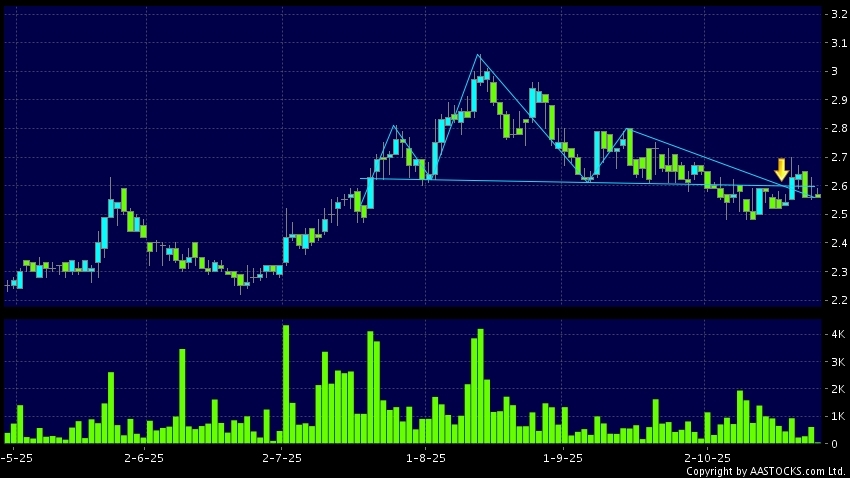 ASIA CEMENT CH(00743.HK)  -0.010 (-0.391%)   appears a downside breakout, dropped below the neckline. Last printed at 2.560; Flattish; on volume of 44.50K shares and turnover of $114.73K