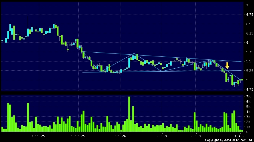 Triangle Breakout means the volatility of price movement is decreasing, stock price finally broke the bottom of triangle. A downward trend will start.(HK stocks quote is delayed for at least 15 mins.Short Selling Data as at 2026-04-02 16:25.)