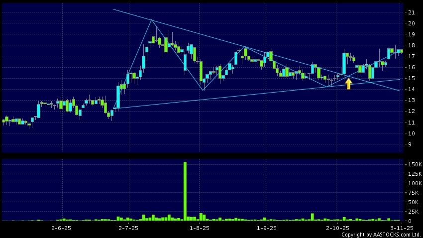 OSL GROUP(00863.HK)  +0.640 (+4.035%)    Short selling $73.70M; Ratio 67.296%   shows a triangle breakout. Last printed at 17.420; fell 1.023%; on volume of 171.50K shares and turnover of $2.98M
