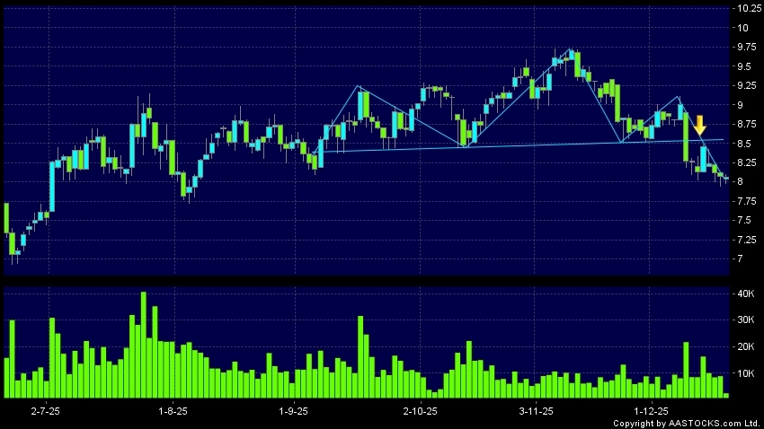 XINYI GLASS(00868.HK) appears a downside breakout, dropped below the neckline. Last printed at 8.060; fell 0.124%; on volume of 2.47M shares and turnover of $19.87MRecent Performan...