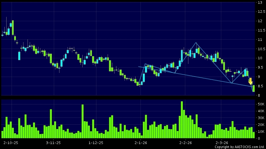 LONGFOR GROUP(00960.HK)  -0.430 (-5.006%)    Short selling $37.84M; Ratio 26.770%   appears a downside breakout, dropped below the neckline. Last printed at 8.190; fell 4.657%; on volume of 9.18M shares and turnover of $76.18M
