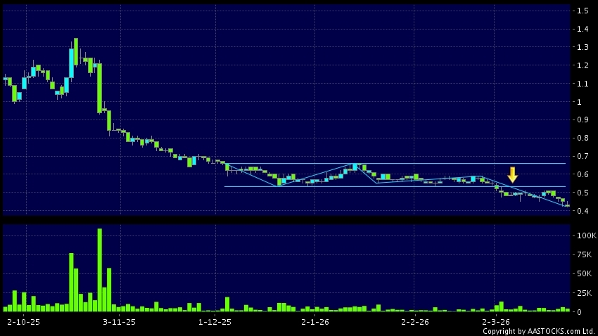 IDREAMSKY(01119.HK)  +0.015 (+3.704%)   appears a downside range breakout. Last printed at 0.425; fell 5.556%; on volume of 4.09M shares and turnover of $1.75M