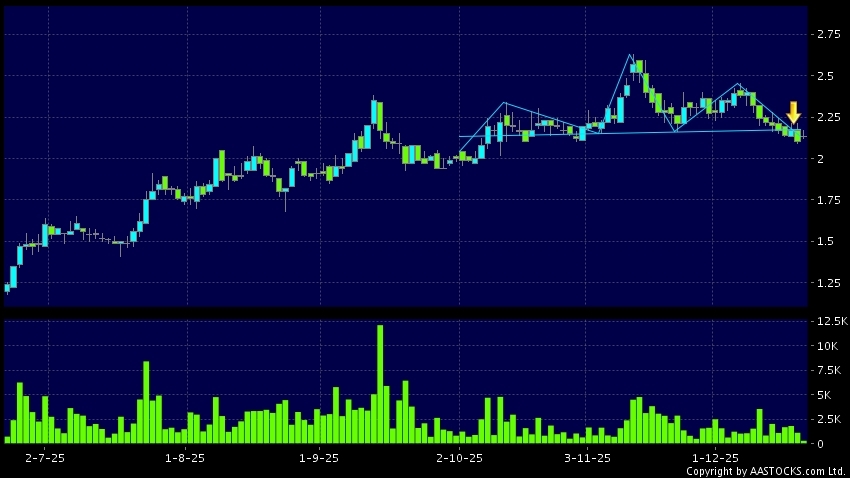 MIDLAND HOLDING(01200.HK)  -0.070 (-2.979%)   appears a downside breakout, dropped below the neckline. Last printed at 2.130; rose 1.429%; on volume of 288.00K shares and turnover of $615.16K