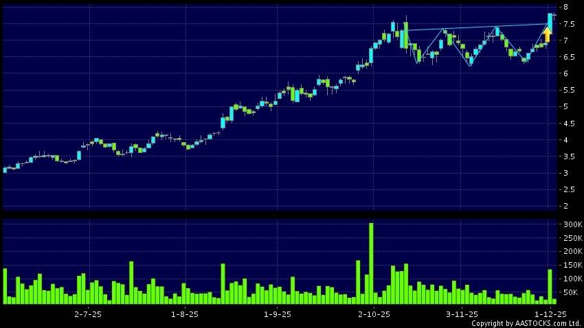 MMG(01208.HK) appears an upside breakout, rose above the neckline. Last printed at 7.770; fell 0.385%; on volume of 25.78M shares and turnover of $199.47MRecent PerformanceIn 3 day...