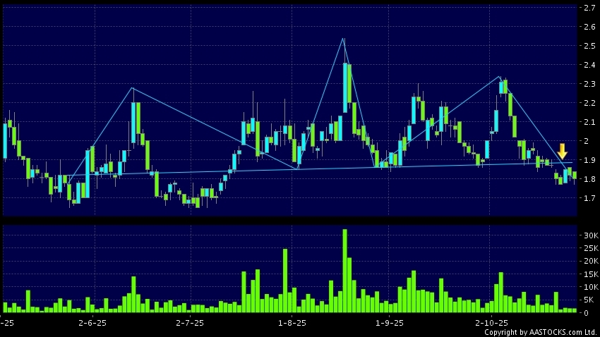 BRII-B(02137.HK)  -0.040 (-2.139%)   appears a downside breakout, dropped below the neckline. Last printed at 1.800; fell 1.099%; on volume of 1.69M shares and turnover of $3.04M