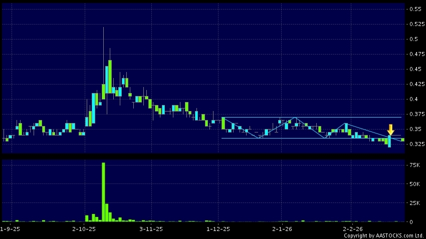 CHINA GRAPHITE(02237.HK)  +0.015 (+4.478%)   appears a downside range breakout. Last printed at 0.330; fell 2.941%; on volume of 240.00K shares and turnover of $80.05K