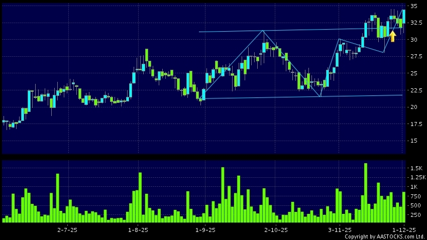 BIOCYTOGEN-B(02315.HK)  -0.720 (-2.040%)   appears an upside range breakout. Last printed at 34.400; rose 8.176%; on volume of 861.53K shares and turnover of $28.32M