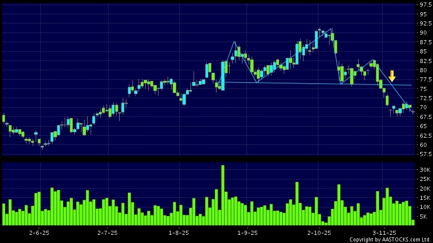 SUNNY OPTICAL(02382.HK)  -0.900 (-1.287%)    Short selling $101.83M; Ratio 19.767%   appears a downside breakout, dropped below the neckline. Last printed at 68.650; fell 1.858%; on volume of 3.35M shares and turnover of $230.68M