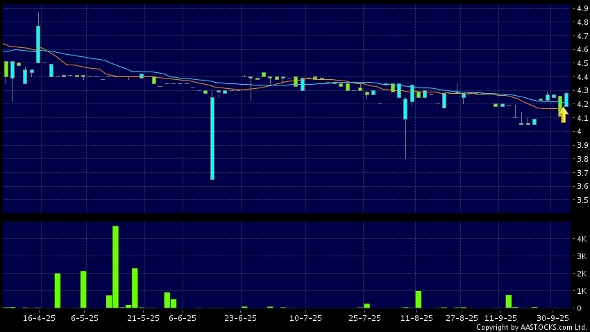 SEACON(02409.HK)'s SMA 10 crosses above SMA 20, which is a golden cross. Last printed at 4.280; rose 4.136%; on volume of 4.00K shares and turnover of $16.83KRecent PerformanceIn 3...