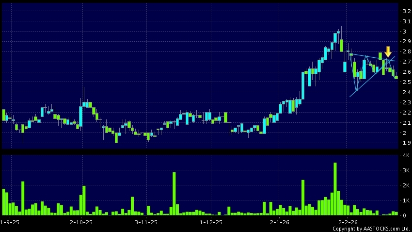 EDIANYUN(02416.HK)  +0.040 (+1.581%)   shows a triangle breakout. Last printed at 2.530; fell 1.172%; on volume of 225.00K shares and turnover of $573.85K