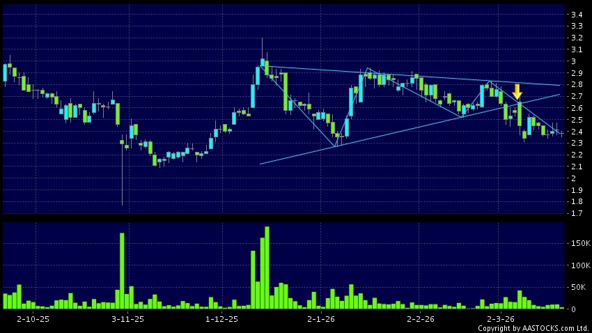 Triangle Breakout means the volatility of price movement is decreasing, stock price finally broke the bottom of triangle. A downward trend will start.(HK stocks quote is delayed for at least 15 mins.Short Selling Data as at 2026-04-02 16:25.)