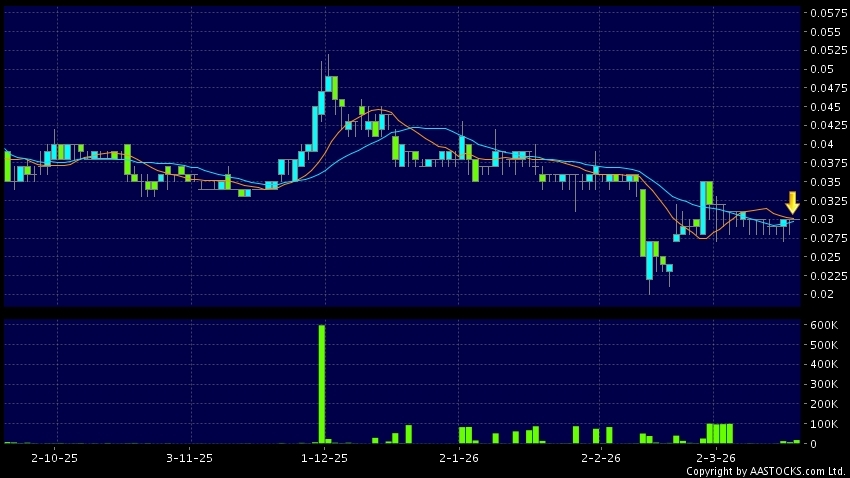 SHANGHAI XNG(03666.HK)'s SMA 10 crosses below SMA 20, which is a death cross. Last printed at 0.030; Flattish; on volume of 17.72M shares and turnover of $531.54KRecent Performance...