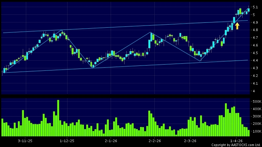 BANK OF CHINA(03988.HK) appears an upside range breakout. Last printed at 5.090; rose 0.992%; on volume of 118.47M shares and turnover of $602.77MRecent PerformanceIn 3 days: +1.19...