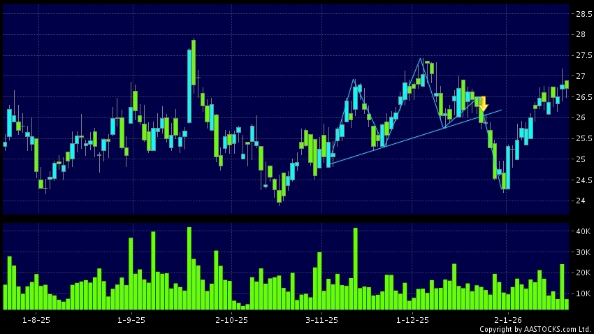 Head Shoulders top is a typical bearish signal, when stock price breaks the supportive level, downtrend would possibly start.(HK stocks quote is delayed for at least 15 mins.Short Selling Data as at 2026-01-23 12:25.)