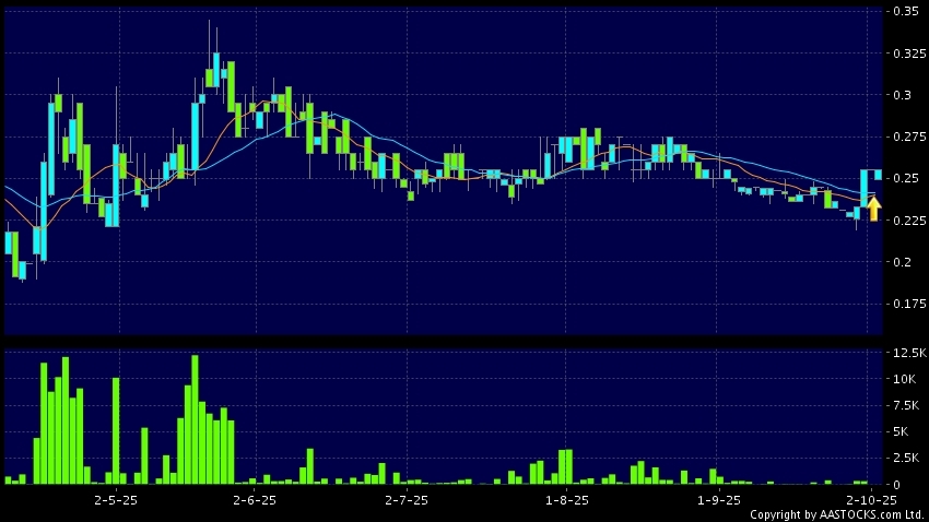 CHINA HONGGUANG(08646.HK)  +0.007 (+3.139%)   's SMA 10 crosses above SMA 20, which is a golden cross. Last printed at 0.255; Flattish; on volume of 6.00K shares and turnover of $1.51K