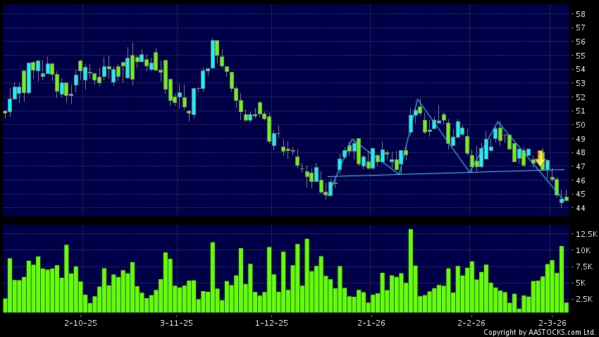 NONGFU SPRING(09633.HK) appears a downside breakout, dropped below the neckline. Last printed at 44.500; fell 0.269%; on volume of 1.98M shares and turnover of $89.05MRecent Perfor...