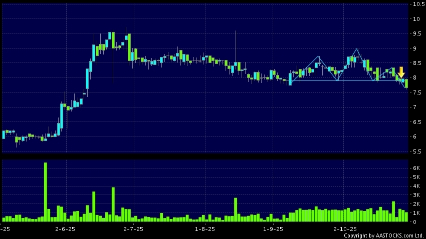 BEISEN HOLDING(09669.HK) appears a downside breakout, dropped below the neckline. Last printed at 7.650; fell 3.894%; on volume of 1.07M shares and turnover of $8.35MRecent Perform...