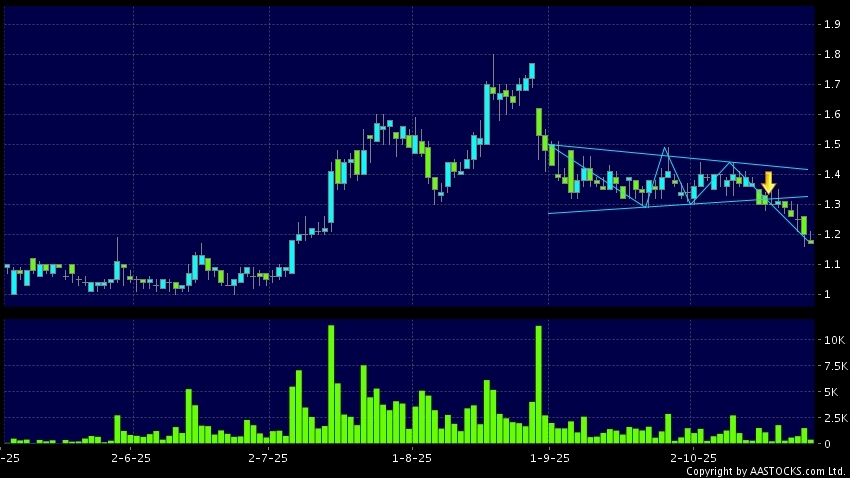 Triangle Breakout means the volatility of price movement is decreasing, stock price finally broke the bottom of triangle. A downward trend will start.(HK stocks quote is delayed for at least 15 mins.)