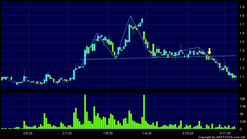 CLOUDR(09955.HK)  0.000 (0.000%)   appears a downside breakout, dropped below the neckline. Last printed at 1.100; fell 1.786%; on volume of 35.90K shares and turnover of $38.81K