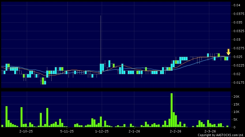 HUIJING HLDGS(09968.HK)'s SMA 10 crosses below SMA 20, which is a death cross. Last printed at 0.025; Flattish; on volume of 2.00K shares and turnover of $50.00Recent PerformanceIn...