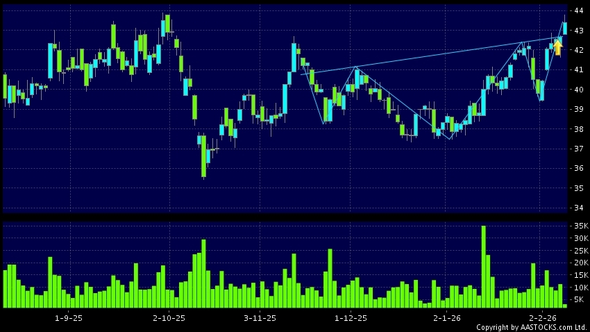 头肩底是典型的利好讯号,当股价升穿阻力线时,升势确认股价将持续上升,技术走势向好。(港股报价延迟最少十五分钟。沽空资料截至 2026-02-10 16:25。)