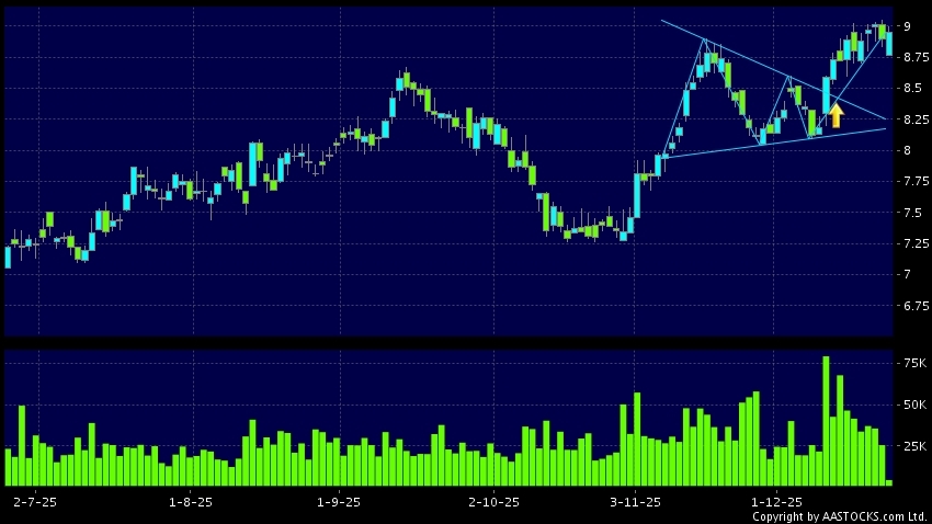 三角形向上突破是指股价的波幅渐渐收窄,在图表上形成三角形般的状态。股价在三角形的末端向上突破,形成上升趋势,技术走势向好。(港股报价延迟最少十五分钟。沽空资料截至 2025-12-31 12:25。)