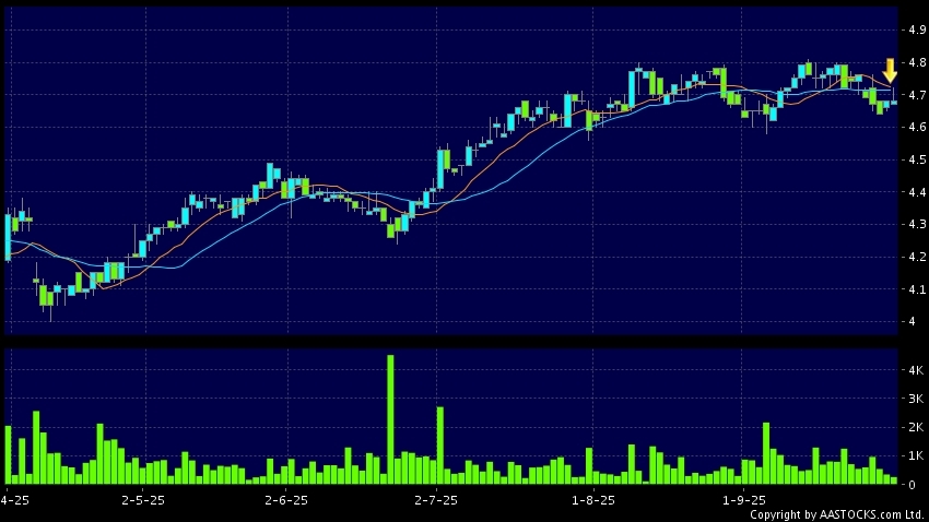 数码通电讯(00315.HK) +0.030 (+0.642%) 沽空 $78.72万; 比率 31.899% 10天移动平均线跌穿20天移动平均线,出现死亡交叉。现价报4.690,上升0.214%,成交量26.35万股,成交额1.24百万。