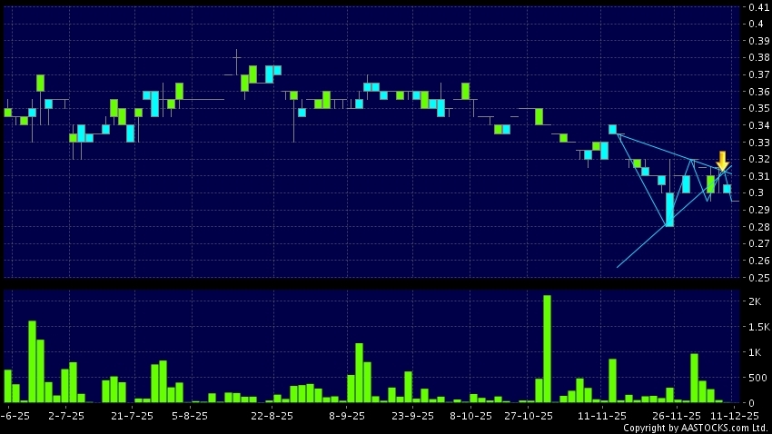 三角形向下突破是指股价的波幅渐渐收窄,在图表上形成三角形般的状态。股价在三角形的末端向下突破,下跌趋势形成,技术走势偏软。(港股报价延迟最少十五分钟。)
