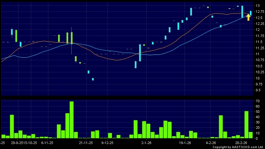 南顺(香港)(00411.HK) +0.200 (+1.587%) 10天移动平均线升穿20天移动平均线,出现黄金交叉。现价报12.780,上升1.429%,成交量1.20万股,成交额15.32万。