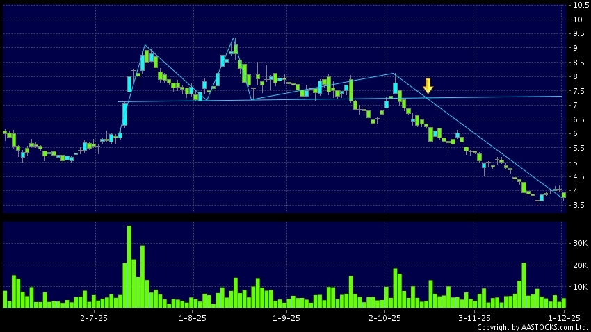 博雅互动(00434.HK) -0.110 (-2.771%) 沽空 $2.29百万; 比率 19.884% 呈现头肩顶向下突破。现价报3.760,下跌6.468%,成交量4.66百万股,成交额1.76千万。