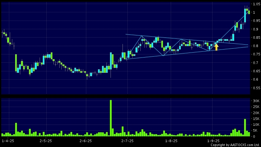 呷哺呷哺(00520.HK) -0.020 (-2.000%) 呈现三角形向上突破。现价报0.990,下跌1.980%,成交量3.71百万股,成交额3.72百万。