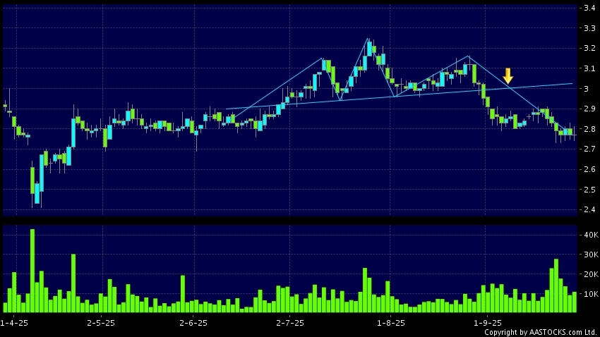 头肩顶是典型的沽出讯号,当股价跌穿支持线(颈线)时,跌势确认股价将持续下跌,技术走势偏软。(港股报价延迟最少十五分钟。沽空资料截至 2025-10-10 16:25。)