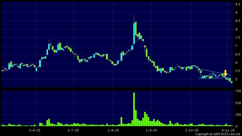三角形向下突破是指股价的波幅渐渐收窄,在图表上形成三角形般的状态。股价在三角形的末端向下突破,下跌趋势形成,技术走势偏软。(港股报价延迟最少十五分钟。沽空资料截至 2025-11-20 16:25。)