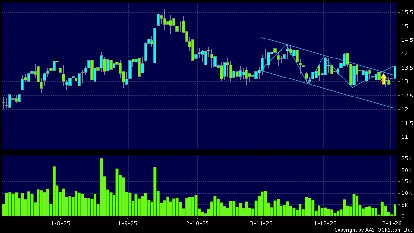 区域突破指股价在过去的一段时间只在一个范围在内活动,然後股价上升作出突破,升穿区域的顶部,技术走势向好。(港股报价延迟最少十五分钟。沽空资料截至 2026-01-16 16:25。)