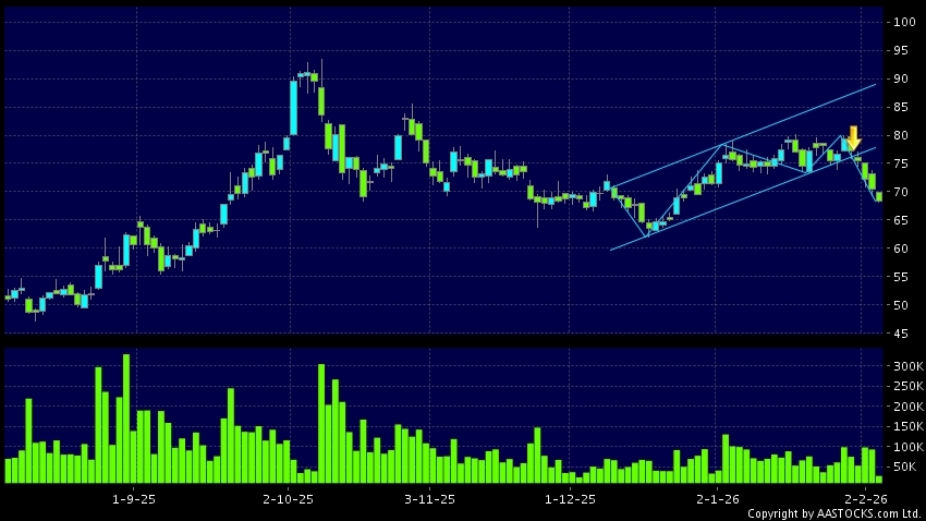 区域突破指股价在过去的一段时间只在一个范围在内活动,然後股价下跌作出突破,跌穿区域的底部,技术走势偏软。(港股报价延迟最少十五分钟。沽空资料截至 2026-02-05 16:25。)