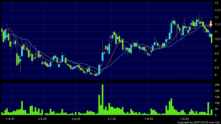 小菜园(00999.HK) +0.610 (+6.094%) 10天移动平均线跌穿20天移动平均线,出现死亡交叉。现价报10.240,下跌5.882%,成交量4.65百万股,成交额4.82千万。