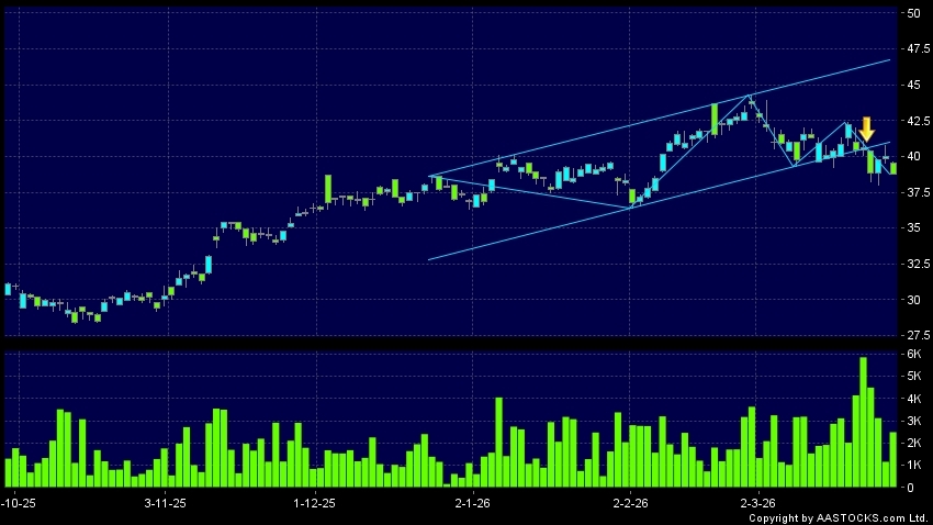 区域突破指股价在过去的一段时间只在一个范围在内活动,然後股价下跌作出突破,跌穿区域的底部,技术走势偏软。(港股报价延迟最少十五分钟。沽空资料截至 2026-03-27 16:25。)