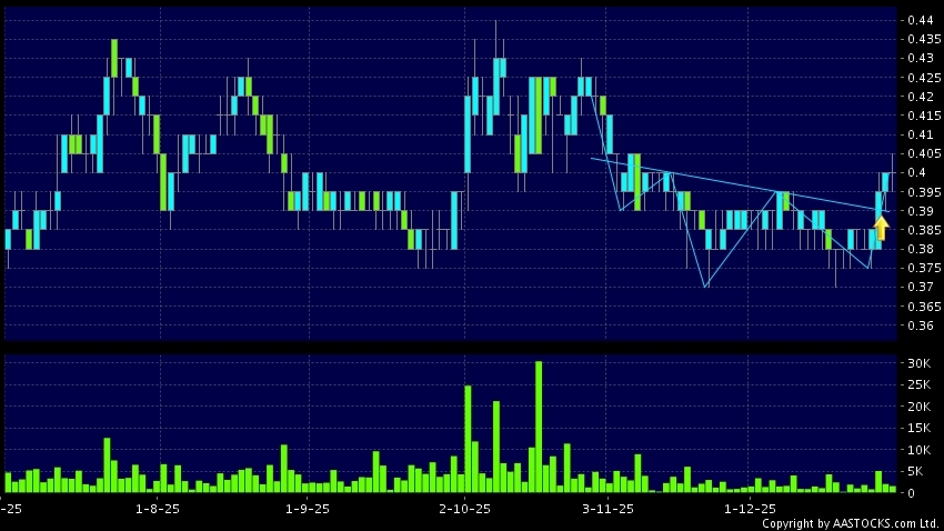 中信资源(01205.HK) -0.005 (-1.250%) 呈現頭肩底向上突破,股價升穿頸線。现价报0.400,无升跌,成交量1.54百万股,成交额61.76万。