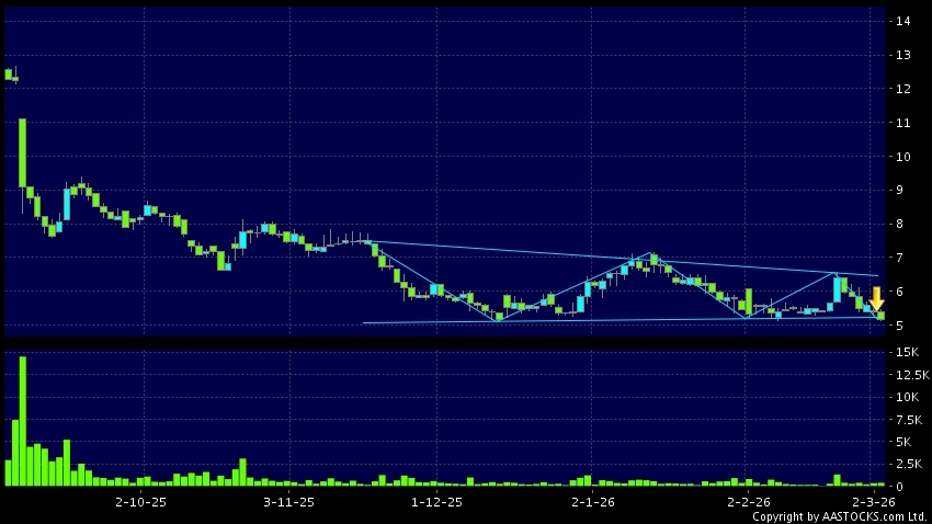 三角形向下突破是指股价的波幅渐渐收窄,在图表上形成三角形般的状态。股价在三角形的末端向下突破,下跌趋势形成,技术走势偏软。(港股报价延迟最少十五分钟。)