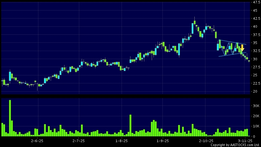三角形向下突破是指股价的波幅渐渐收窄,在图表上形成三角形般的状态。股价在三角形的末端向下突破,下跌趋势形成,技术走势偏软。(港股报价延迟最少十五分钟。沽空资料截至 2025-11-07 16:25。)