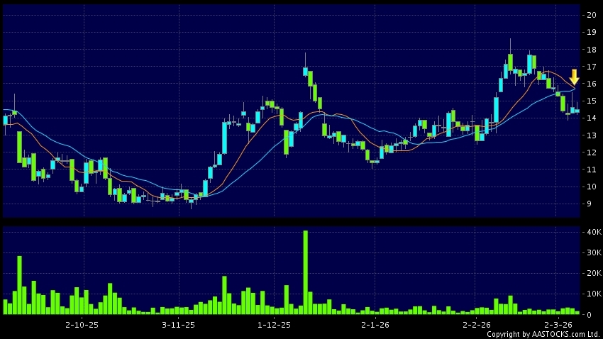 死亡交叉是一个利淡信号,指股价的短期移动平均线跌穿长期移动平均线,例如50天线跌穿250天线,在图表上构成交叉的形状。股价通常会下跌形成一个下降趋势,技术走势偏软。(港股报价延迟最少十五分钟。沽空资料截至 2026-03-10 16:25。)