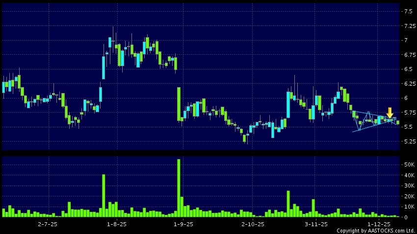 三角形向下突破是指股价的波幅渐渐收窄,在图表上形成三角形般的状态。股价在三角形的末端向下突破,下跌趋势形成,技术走势偏软。(港股报价延迟最少十五分钟。沽空资料截至 2025-12-12 16:25。)
