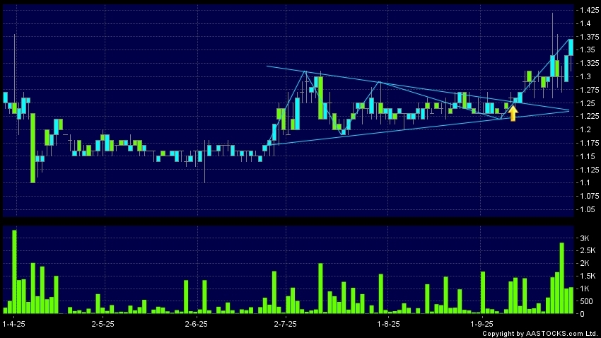 三角形向上突破是指股价的波幅渐渐收窄,在图表上形成三角形般的状态。股价在三角形的末端向上突破,形成上升趋势,技术走势向好。(港股报价延迟最少十五分钟。沽空资料截至 2025-10-24 16:25。)