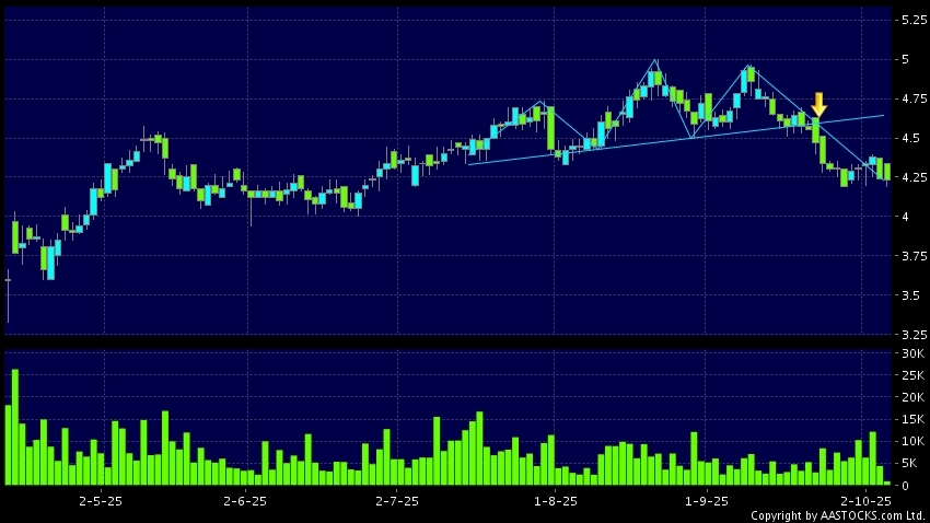 头肩顶是典型的沽出讯号,当股价跌穿支持线(颈线)时,跌势确认股价将持续下跌,技术走势偏软。(港股报价延迟最少十五分钟。沽空资料截至 2025-10-10 16:25。)