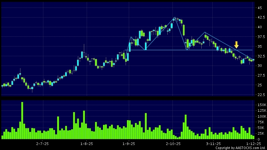 头肩顶是典型的沽出讯号,当股价跌穿支持线(颈线)时,跌势确认股价将持续下跌,技术走势偏软。(港股报价延迟最少十五分钟。沽空资料截至 2025-12-01 16:25。)