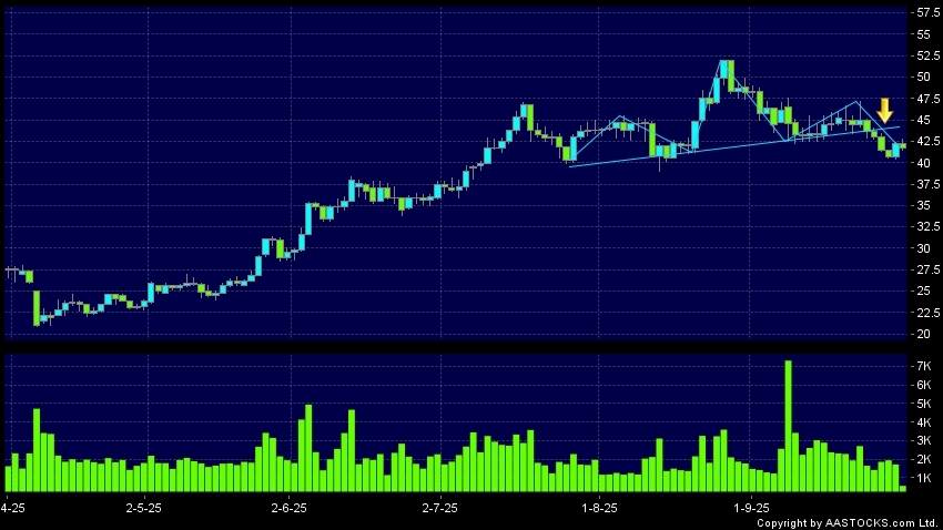 康耐特光学(02276.HK) -1.100 (-2.676%) 沽空 $8.83百万; 比率 10.791% 呈现头肩顶向下突破。现价报41.720,下跌1.137%,成交量57.46万股,成交额2.42千万。